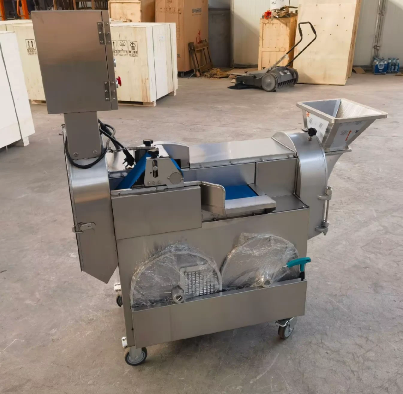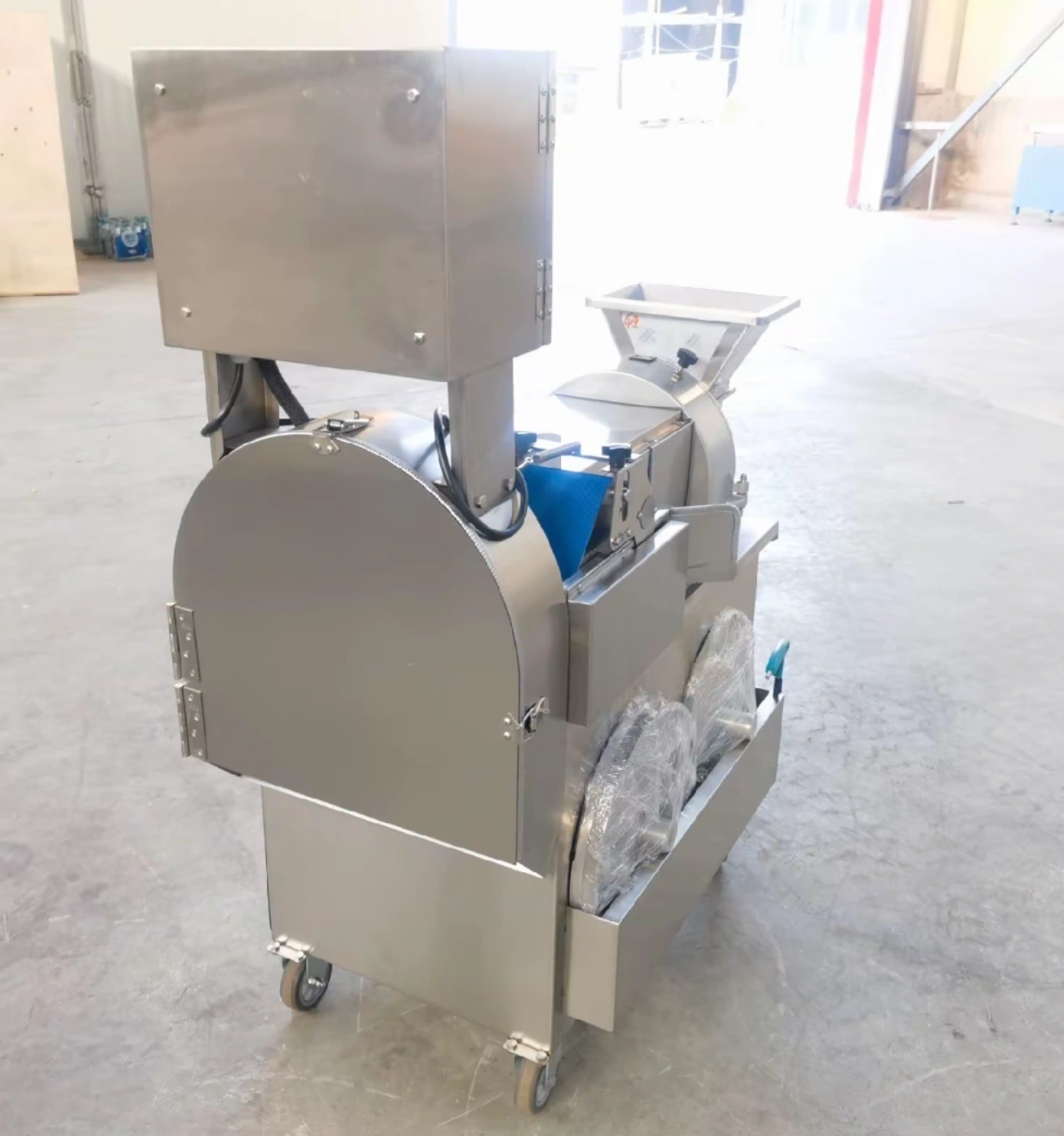 By definition, an industrial dual-head vegetable cutter features two independent cutting stations powered by separate copper-core motors: a conveyor-fed guillotine side for leafy vegetables, and a rotary centrifugal hopper side for slicing, dicing, and julienning hard root vegetables.